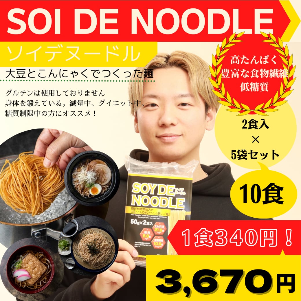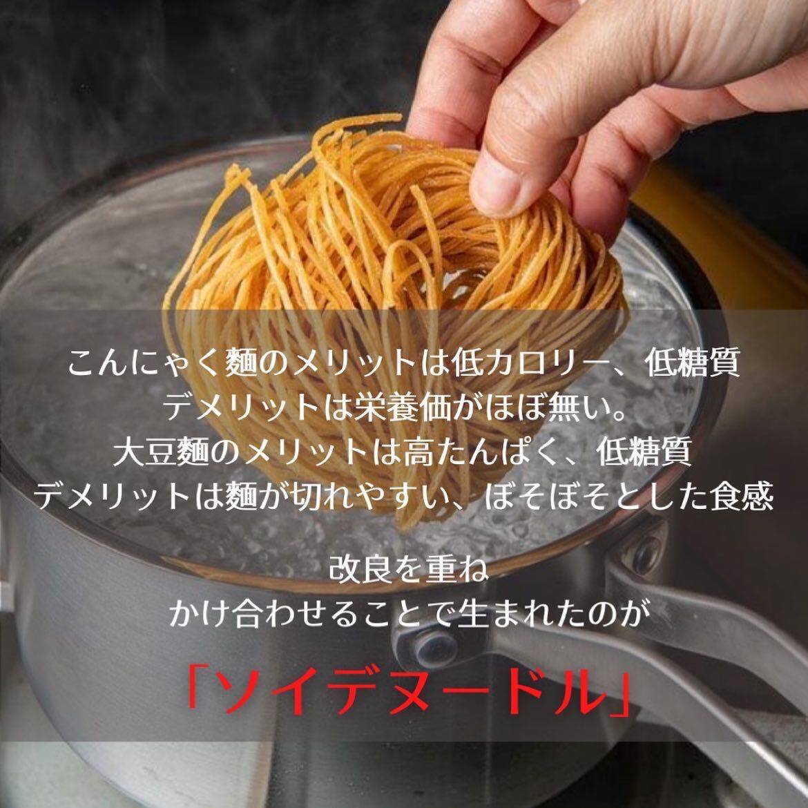 ソイデヌードル(SOY DE NOODLE)は、大豆とこんにゃくで作った乾麺です。